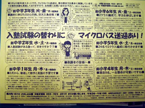 19日は私が決めた 『塾の日』 です!! 今年4度目のチラシが今日入ります。写真のチラシの裏側には塾生が描いてくれたイラストがあります。生徒と塾の合作チラシです。 今日は今日でイラストがいくつか生徒から貰えました。スキャナーも買ったし、チラシ、ハガキに大活躍しそうな感じです。がんばっちゃうぞ~~~ そりゃそうと、20日には15人乗りのバスが到着する。それにあわせて『運転手さん募集』のチラシを作ってみた。前はタウン誌などに入れていたが、あまりに広範囲に入ってしまうので、応募者が多すぎて困っていた。なので初めてチラシを作ってみた。 生徒募集のチラシは年がら年中作っているからなれたけど、『運転手さん募集』の自前のチラシは初めて作った。26年目にして初体験だった。 枚数は2000枚だけにして地域限定でやってみた。 結果は、バッチリヒット。 いい感じの人が決まり、また他にも数件の面談がある。 このチラシはB5のチラシ。。。。。 B5のチラシって初めて作った。 試しに『生徒募集』にも使ってみようと思う。 B4より情報量も少ないが、それがいい点もある。 なによりコンパクトなのがいい点かな? 今日はチラシが入るので塾に行く。 っていつも行っているけど 試作品作りながら電話番しよう。なんでも試してみるもんだな~~~☆☆☆ハガキもピンクハガキからクリームハガキにチェンジします~~~☆☆☆■よびりん様の元気の出るプログです!!■愛機2029。メンテナンスの様子です。大事な戦闘機です。■戦闘機の水洗いには、私の息子も学徒動員しています。☆7月12日に『静岡県ネット』に登録してみました。静岡ネットランキングをポチッとクリックしてくださいね。総合で10位位でウロチョロしています♪♪忘れてはいけない神風特別攻撃隊の武士道。塾版:僕の日誌です♪♪塾版:ミユキ先生の日誌です♪♪塾版:ヒロミ先生の日誌です♪♪