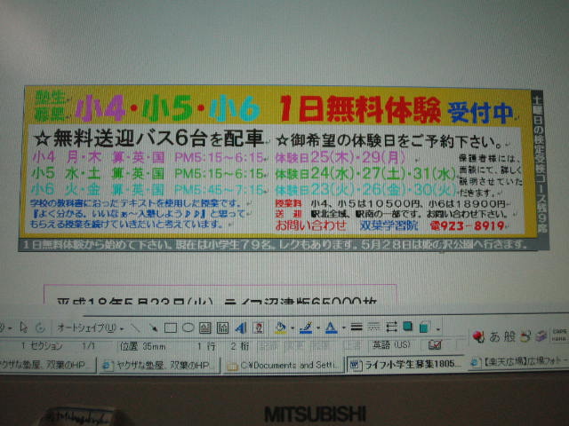 午前0時41分。中1の片面印刷終了。415人の中1に発送する。今日21日はチラシが10100枚入り、このハガキは22日の月曜日配達され、23日の火曜日にはライフニュース65000枚が入る。 月末の広告としては、まぁ上出来としておこう。 この続きの印刷は今日の昼間にやって夕方投函ってとこだな。 中1が終わったら中2と中3の募集ハガキを作ろうと思う。生徒募集は、僕の楽しみの一つだな。変かな?でもおもしろいんだな。 おっとチラシ用の用紙15000枚も到着している。 28日のチラシも作らなきゃならない。ランボーのように、パソコン3台、プリンター3台、印刷機2台を操るぞ~~~☆