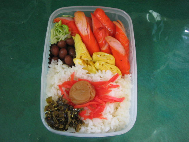 本日の弁当は奥方作成。赤ウィンナーが入っている。よしよし!! これで1日飛び回れるぞ。昨日は91名の生徒が来たが今日は77名がくる。がんばっちゃうぞ。。。