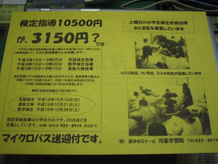 さて、真夜中の印刷屋さんの開店。 ちょっと志向を変えて小学生検定指導の写真を入れてみた。ヒットするかな?まぁ、質より量だと思っているので、これでいい。 ちなみに片面は↓↓↓↓ 感想を書き込みいただければ嬉しいです。ソフトにして下さいね。私は気が小さいので、優しくお願いします~~~☆10100発チラシ弾の製造じゃぁぁああ~~~☆☆☆ 午前0時13分、印刷完了!!