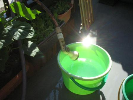 13日は、しっかり酷暑でした。で、私はベランダに避暑です。エメラルドグリーンは自分で作れます!!飛行機で行かなくても!! 高校野球は、ベランダから見ました。片手にビール、もう片手に煙草、脚はもちろん水の中です。 コーナーの植物にもたっぷりどころか、水攻めです♪♪ キュウリちゃんは、何日かすれば食べごろかも。。。 『もう少ししたら、食べちゃうぞ!!』 と思いました。(うそです) ノー天気な1日でした~~~~~~~☆