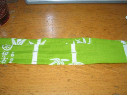 今日から仕事再開。しっかり酷暑だ。 昨夜は家族揃って『韓の食卓』にでかけ焼肉三昧。 『俺が奢るよ♪♪』で良く食べた。 暑くなるのを覚悟して『鉢巻作って。』で完成したのがこのハチマキ。 送迎の時に使うんだな。これ。帽子じゃ暑いしね。