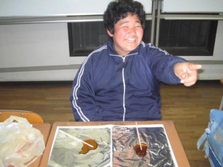 これはさっき撮った、『べっこう飴』作りの写真。融解と凝固の状態変化の実験。それよりおっさんぶりがいい。