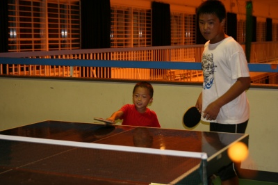 合宿の夜は体育館で遊びました。 お兄ちゃんたちと一緒に卓球。どこにでもボールが飛んでいってしまうので、お兄ちゃんたちは大変です。大きなボールで遊んだり いちばんおもしろかったのは、ロッククライミングの練習。上には上れないので、横にどんどん渡って行きます。みんな夢中になってました。2日目予定の登山は台風のため中止。去年の合宿での登山は大変な思いをした母ちゃんですが、今年どれだけFUURINが歩けるようになったか楽しみにしていたので、中止はとても残念でした。 朝食前にコーチがクワガタを見つけてくれて、大喜び。朝食後、台風がひどくならないうちに帰りました。