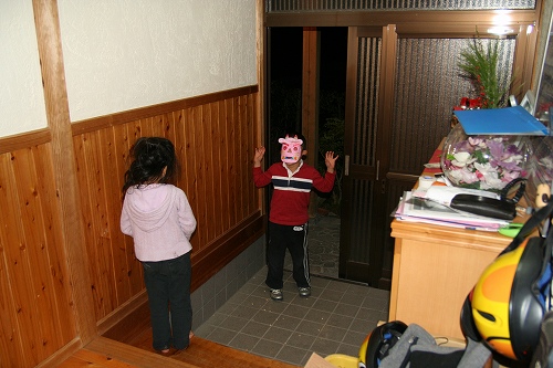 RIN鬼がお~おにはー外!満足父ちゃん鬼をやっつけろ~年の数の豆を食べました。FUURIN5個づつ。あっという間。母ちゃん41個。食べるの大変!FUURINが口に次々と入れてくれました。鬼のお面はFUURINが保育園で作ってきました。