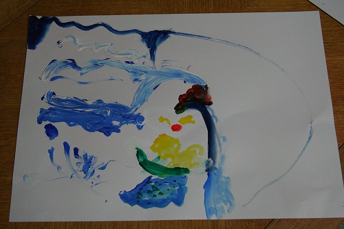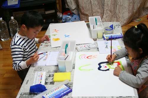 FUURINの生活発表会本番は無事先週の土曜日に終わりました。心配していたFUUも意欲満々で参加できました。RINもノリノリ楽しませてくれました。火曜日夕方からRINが熱発。すぐに診察。水曜の明け方からはFUUが頭と喉が痛いと訴えて朝一で診察。二人ともインフルエンザでした。今日はすっかり二人とも元気いっぱいでしたが、念のため今日まで保育園はお休み。お昼にはお絵かきを絵の具でやってみることにしました。保育園では月に1度絵画教室があっていますが、家で絵の具をつかうのは初めてです。FUUは2枚目は指でいっぱい丸をかいてました。色を重ねて遊んでました。