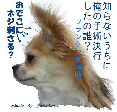 昨日、パーレーツを観に行ったハズが、何故か大日本人を観てしまったので、疲れがドッと押し寄せて、ブログアップ遅れましたぁ~日付はさかのぼり、9日土曜に風助の再検査で病院へ先週は肝臓の薬を飲んで数値を出したので、今回は薬を飲まない状態での数値を測定。その結果、正常値でしたぁ~やったぁーっでも、風助は動物病院の待合室にて、威嚇しまくり・・・最初必ず震えているのに、だんだん待ち時間が長くなるにつれ、目が怖くなり、ついに威嚇他の犬を連れてきてる人は、チワワ=可愛いってイメージが、どんどん崩れていくのであります。。。全ては風助のせいで。。。それと、膝の調子も久々にレントゲンチェックした結果、悪くはなっていないので、経過観察になってますサプリメントのグルコサミンが効いてるみたいだし、フードもこの際、病院処方の物をチョイス私は病院で購入したので、1キロ1,800円でした。1キロの次が3キロなのですが、先生に「フードは酸化が怖いので、出来るだけ1ヶ月以内に食べきる量を」と言われ、1キロにしましたよ。今までのフードも、酸化を気にして2キロを購入してましたが、それでも多かったんですね今までよりちょっと高いけど、おやつも買わなくなったし、その分一番重要なフードに力を入れます待合室で散々騒いで、仕方なく抱っこされるとしてやったり顔で満足げ。ムカツク風助なのれした発作以来、床に布団を敷いて寝ていた私。でも、風助に完全無視されて、一度も一緒に寝なかったナァ。。。今夜からは、ゆっくりベットで寝ますわぁ~ブログランキングに押して欲しいナリチワワブログランキング 人気blogランキングへ @With 人気Webランキング 楽天ブログランキング ブログ広場