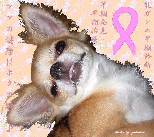 なんとかワンクリックプリーズチワワブログランキング先日、一年ぶりに乳ガン検診へ行ってきました取りあえず、触診終了後に来月のマンモグラフィーの予約をしました。今時、触診と他の人に言われていたんですが、ソンなことは何ひとつ言ってない私に、先生が『今時、触診って馬鹿にする人が居るけど、マンモグラフィーでは90%しか判らないので、触診も大事なんだよねぇ』って。むふぅーそうだよ、だってさ、自己検診は触診だもんね自己触診でしこりがあれば、どんどん大ききなるから判るそうですよ私の場合、内膜症の治療で低容量ピルを服用中だし、歳も歳だし親族に乳ガンの人が居た場合は、やはり遺伝の可能性も否定できないので注意が必要とか。ピンクリボンは乳ガンの、早期診断・早期発見・早期治療のシンボルマークですよ愛犬を守るママさん達、いつまでも健康で居る為に、是非診察を受けて下さいな~>ブログランキングクリクリクリックチワワブログランキング 人気blogランキングへ