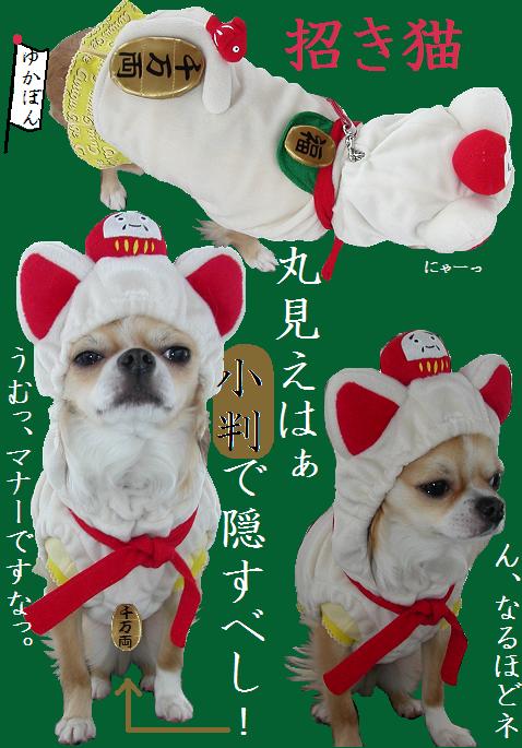 一年前は大きかったコートも、今じゃ・・・にポチッチワワブログランキング皆さんコンバンワン風助です今日もね、お散歩って言われて逃げてた俺だけど、ダッシュの連続でおしっこしてウ○チまでしたから、爽快になって気を抜いた瞬間、抱きかかえられ玄関へ。。。どうしてそんなに拒むのかって寒いのもあるけど、ママが「去年着た招き猫コートあったよね」って探してたのさっ。ゲボーッ、一年前も着させられた、こっぱずかしいあの衣装一年前の日記はこちらhttp://plaza.rakuten.co.jp/fuusuke20060819/diary/200701030000/そして、いよいよ着せられしまって、今年の格好はこうダッ超恥ずい気持ち分かるでしょ(大事な部分は隠されてセーフだけど。。。)しかも、このコートが大きかったイメージがあったらしく、下に着た洋服は全部隠れて見えないだろうと、裏ボアの暖かい洋服を着たらぁ、完全に丸見えヘンテコに拍車がかかったYoしかも、少し積もったフワフワの雪が、俺の肉球にしみるのYoちゅめたいでしゅ歩くときは、かぶり物部分は外してるのに、ちょっと記念撮影となったなら、しっかり被らされてブヒーッまぁ俺もぉ、一年前とは雲泥の差で成長を遂げたからね、来年はこのふざけたコートともおさらばなのさっ