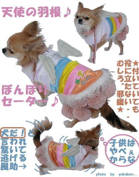 若干ピエロ的な衣装にポチッチワワブログランキングうぅぅぅ~、寒くてホッペが真っ赤かな私今日はね、「お散歩行く」の問いかけに、体を床に付け両手両足を伸ばし、行くぅのポーズで甘える風助おぉ、そうかいってんで、抱っこして玄関に行ったらまだ外に出てないのに極寒それでも、福袋に入っていたセーターにひよこ天使ベストを着せていざ外へ画像をポチッとすると、商品のページに行けるよ外へ出たら、ご近所さんに会って、「そんな細い足でお散歩するの」と心配されちゃった。注:細い足ってのは、もちろん風助のコトヘンテコな格好で歩いていると、小さな女の子が大声で「犬が居るぅーっ」と叫んだ。風助はビックリして、速攻その場から立ち去ったのでR。その姿は、まるで天使の羽根で空を飛んでいるようだった