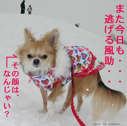 風助も仰天のランキングに、ただただ感謝チワワブログランキング俺は今日、「お散歩」の言葉に、のら~りくら~り作戦決行いきなりの狸寝入りそんで薄目を明けて様子見でもなぁ~外には行きたい感じぃだけど今は行きたくないだから行きそで行かないまずはボールで遊んでみるそれから、えーっと「おしっこしなさい」って言われて、ゲージに入るも、出そうで出ないみたいなギャハハハハ~ママのイライラぶりが楽しいのだぁ~でもぉ、なんだかんだで15分経過した頃、とうとうオシッコしちゃったからぁ、お散歩行き決定のら~りくら~り作戦のせいで、雪が降って来ちゃったよぉ そんな中、俺様の山へ向かうも、誰かスキーで滑ってるチッキショープンプン状態の俺は、雪が降りしきる中、クンクンしまくっやったのさっそして吹雪の中、帰路に着いた俺の顔は見るも無惨・・・その模様は明日ね