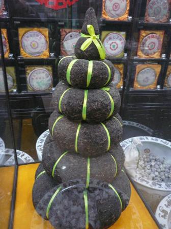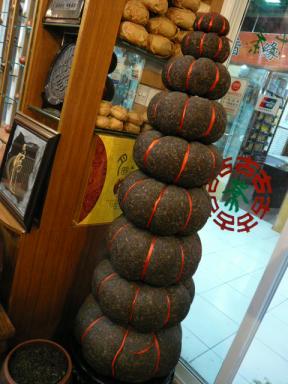 日本だと「プーアール茶」=「ダイエットティー」という図式が確立されているようですもちろん中国でもそういう知識も意識もあるだろうけれど、やっぱりプーアールの個性的な味が好きだから飲んでいるって人のほうが多いかな お茶市場では、こんなおもしろい形のプーアール茶があります なんだか昔のおばあさんの付け毛を段々に重ねてるみたいでしょ 壁にはたくさんのプーアール茶が飾ってあります生茶、熟茶、古いもの新しいもの・・・同じプーアールでも味が全然違います お買い物の間に行きつけのプーアール専門店でお茶をいただきながら、しばし休憩お茶市場に行くとお腹がダップンダップンになるほど、お茶を飲んでしまいます どれもこれもおいしいわね~ これはプーアールを入れるカゴですかわいいプレゼントする時には、こんなカゴに入れてあげると喜ばれそうですねおいしいプーアールをたくさん買いだめして、ゆっくり時間をかけて飲んでいきましょう
