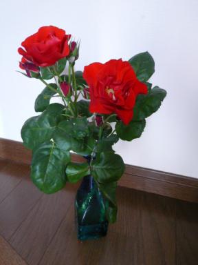 道をはさんだ前のおうちの庭にバラが咲いてます マリンと自分の家の庭の雑草をひきながら、きれいだなーと眺めているとおうちの方が家からでてきました年配の方で、あまり言葉を交わしたことがなかったのですが、マリンちゃんが好き好き~ とシッポを振りながら甘えていくとわんこが好きらしいその方は「あらー、かわいいわねー」と言って、バラの花を2本くださいました 真っ赤なバラが輝いてます~お部屋がいっきに明るくなりました ご近所付き合いは大事にしなくちゃね ありがとうございまちゅ