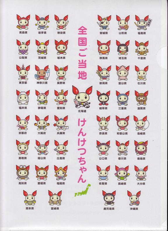 以前、献血した時に貰った、全国ご当地けんけつちゃんクリアファイルを発掘しました。(^^;)因みにこんなのです。ご当地キティちゃんと同じような感じですが、センスがちょっと違いますね。何だか微妙なところが良い感じです(笑)。各都道府県の名物だったり有名人だったりするんですが、何だかよくわからない物も・・・。例えば岩手県。「銀河鉄道の夜」のジョバンニなのでしょうか?例えば埼玉県。お菊人形のようなのは何なんでしょうか?例えば岐阜県。お腹に「飛騨」って書いてますが何が何やら・・・。鳥取県はお腹に「20」と書いてますし、へたが付いてるので二十世紀梨でしょう。福井県もよくわかりません・・・。まだまだ勉強が足りませんな。(-_-;)