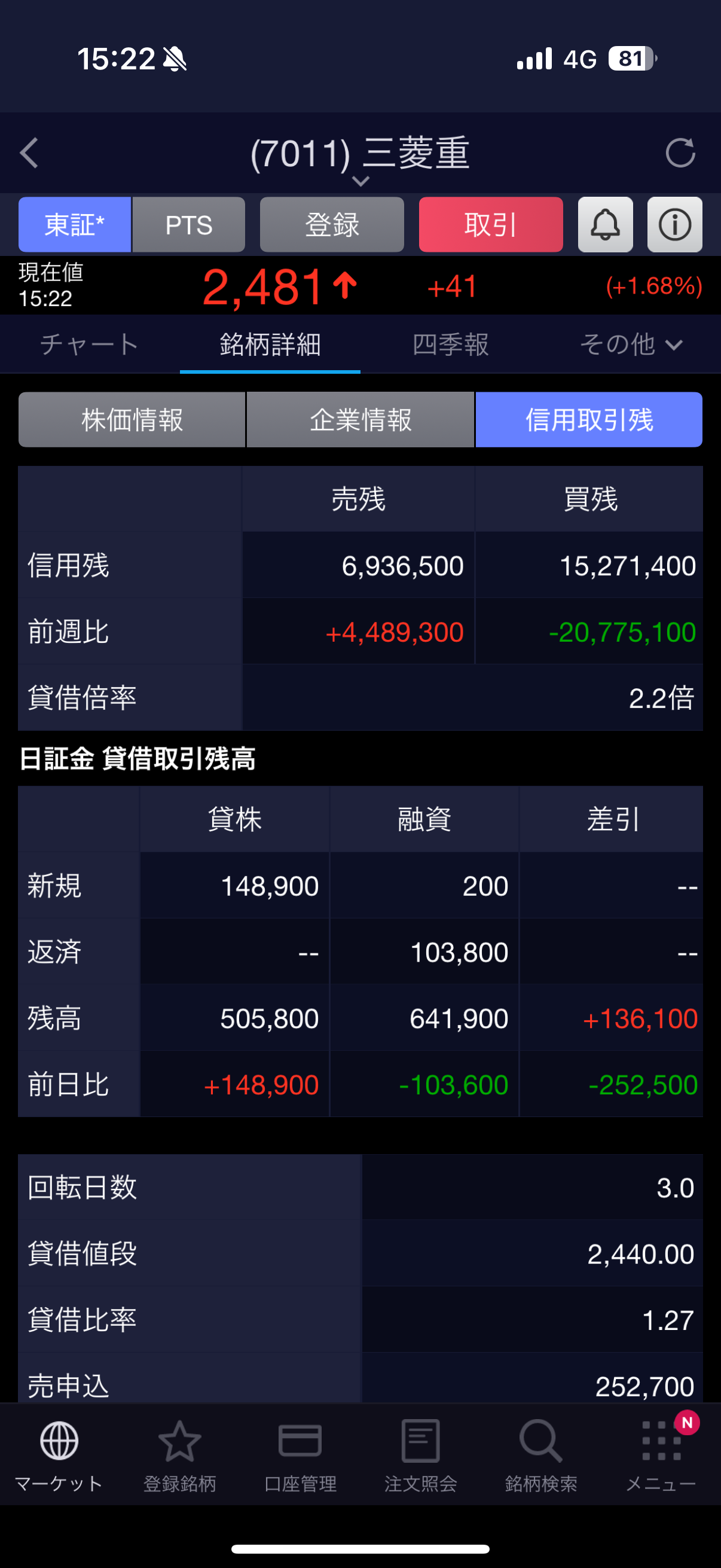 軍需関連が熱いですね。この株安の最中でも最高値を更新。下がったと思いきや戻ってきました。確かに今お金を入れられそうなの軍需くらいしか日本にないですよね。うごめく余ったお金が集中するのも理解できます。だけど買ってもすぐビビっちゃうので。三菱重工per34に対して川崎重工、IHIはper20もいっていないので比較すると割安に見えます。信用買いも激減ですよ。