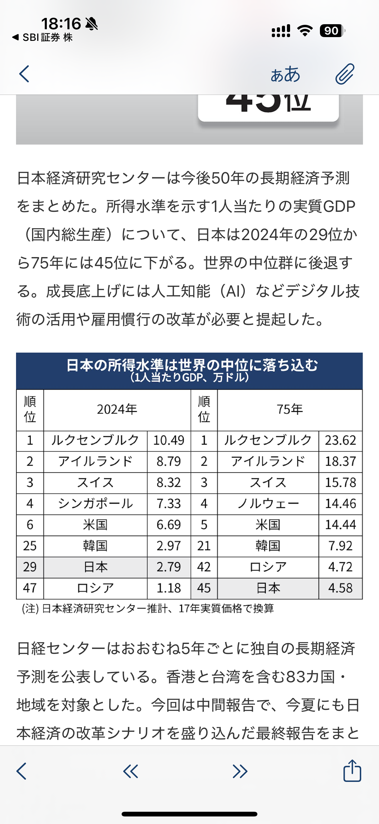 強烈ですねぇ。すごく短期目線では、車業界がくらいますが、長期的な目線では日本全体の産業がそこそこというかかなりくらう内容な気がします。また日経デジタルより、2075年には日本の一人当たりのGDPが現状の29位から45位まで落ちるという予想も出ていました。ワロスその時にはロシアよりも下になるみたいなので、恐ろしいですね。完ぺき新興国。またそのころには国のGDPも11位になっていそうとのこと。今が3.5兆ドルで、50年後に4.4兆ドル。と。。。ほとんど伸びていないwそのころにはインドが今3.1兆ドルから13.8兆ドルになっているでしょうと。まじか。日本って、私の親世代がめちゃがんばって、富と技術を蓄えましたがその富をうまいことアメリカにかすめとられて終わったような気がします。いやー。安倍さんを手にかけた主体って何者なんだろ。人間社会って、学校で教わらなかったことが、メインだったんだな。というかどすぐろい人間がたくさんいるんだろうな。すごいわ。しかし搾取されたなあ。ばからしかった。。だけど、NISAでTOPIX買っている場合ではなかったですね。インドネシアとか20年後とかに伸びていそうなところに賭けておかないといけないけど、このあたりになってくると、信託報酬が高いですね。インドネシアかインドかブラジルあたりが良さそうだけどなぁ。手数料安いのは、アイザワかな。?