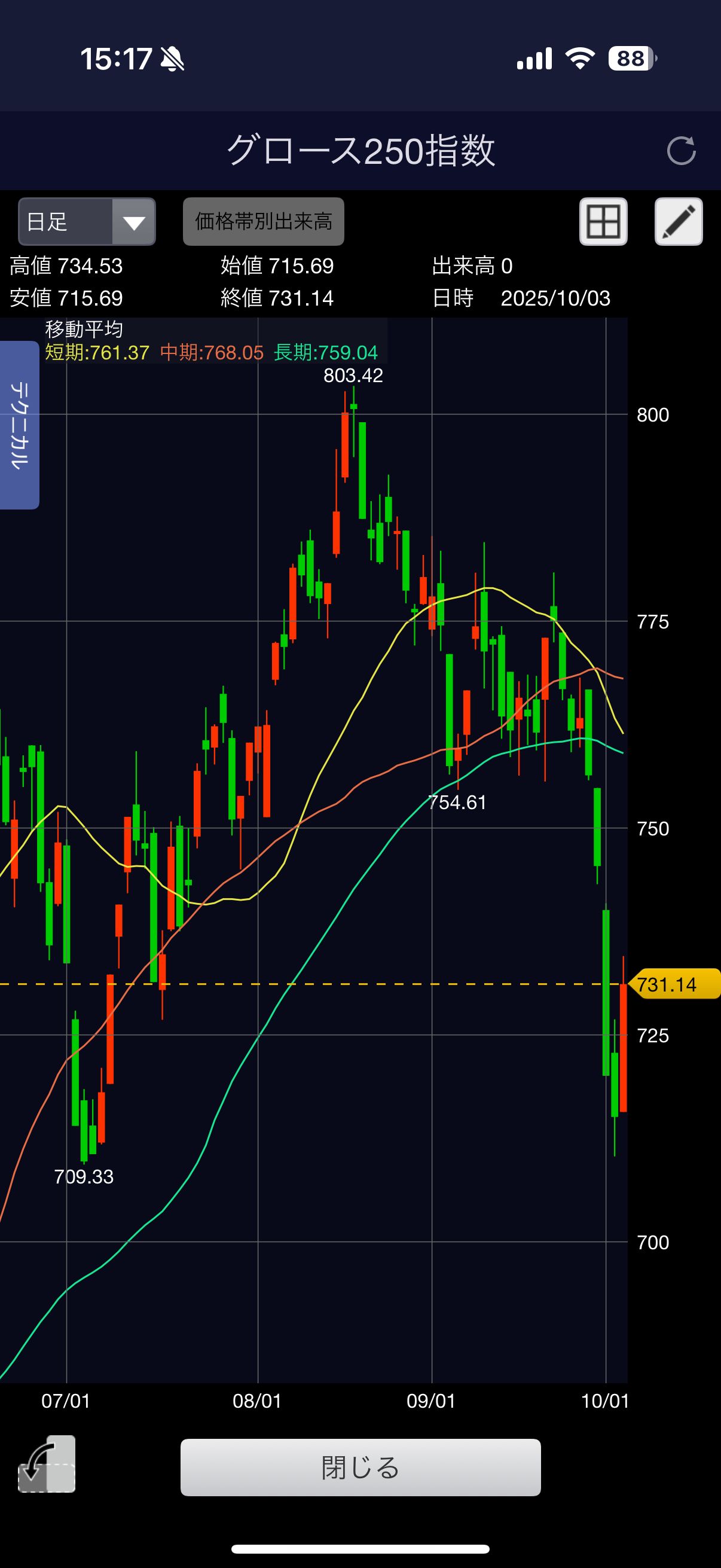日経は、高市さんになるぜ。なったぜ。で、最高値49950円くらい。多くの人が5万円を越えるとみていましたが、惜しかったですね。けどすぐに超えるかもしれないですね。しかし、、結構な高値。日経。ここから高市さんが株価が上がるようなことをしてくれたとして、、上がるのかなぁ。よくわからん。利上げは12月?昨日くらいから、急に10月利上げ?みたいな雰囲気を醸し出していたけれど、12月くらいなのかなー。という感じもある。利上げきたらまた売られそうだな。日本株。PERも高いですしね。願わくばまた下がってくれて、今度こそそこで買いたいですよね。けど、下がり待ちの人も結構いそうな気もするので、、どうなんでしょうね。しかし、そろそろ、楽天を買う。のが良さそうな。