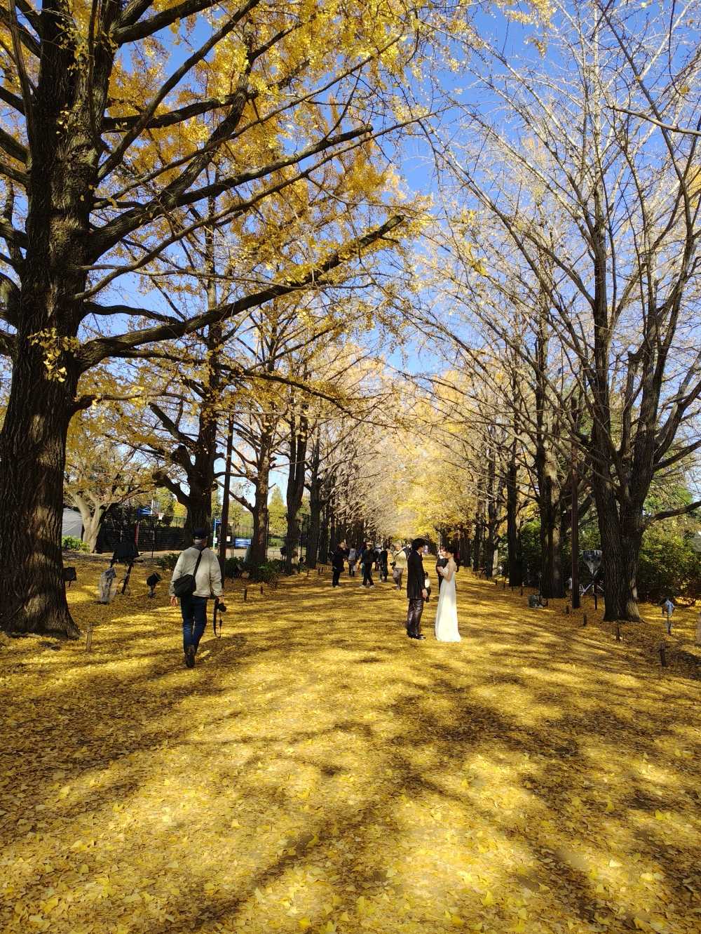 たたらいのイチョウ並木も既に落葉、結婚式の前撮り写真を撮っていました。