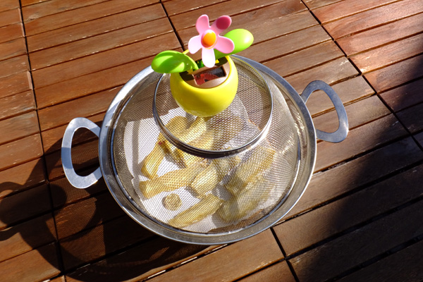 手作り、干しいも(乾燥芋)鳥に食べられないように網ザルを蓋にして。2日目上にのっているのは、100円ショップで購入してきた、なんだかわからないお花干し芋作りに関係ありませんが、太陽光をいっぱい浴びて元気よく動いています。普通のサツマイモを使用しているので、さて、どうなることでしょう?