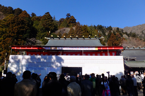 大山阿夫利神社節分祭行事司(豆まき)豆まきの起源は、各地域で五穀豊穣を祈り、その地域で収獲される穀物などをまいたことが始まりとい言われています。時代の変化とともに、魔滅(まめつ)させるという事から、豆を撒く(厄を払う)神事に変わっていったとも。余談ですが、私の生まれ故郷では昔、結婚式の花嫁に豆を投げつける風習がありました。まめで暮らせよと言う意味があるようです。大山阿夫利神社下社の節分祭30分前になると。段々人が増えてきます。撮影はここでストップ。始めは楽勝かなと思いましたが、いざ始まるとすごいですね~! 救護所も設置され、救急、消防隊員もテントと設営し待機しています。戦利品はご覧のとおり。すごいものが飛んできたと思ったら、なんと饅頭でした〈笑い〉。豆の中に、10玉と5円玉が入っていましたが、狙いの小判は拾えませんでした。豆袋の中に、こんな小判が入っていると、これでスクラッチカードと交換できます。空クジなし。豆まきではなく「宝まき」。豪華賞品もたくさんありましたが「デジカメならもらってもいい」。皆さん、始まると人が変わったように、もう命がけでしたね。お相撲さんと、歌手がゲストで来ていましたが・・名前は??山からくだる途中、鹿と遭遇。天気がよく鹿も日向ぼっこ。この日、5頭ほど確認しました。昨年の大雪で、たくさんの鹿が動けず、餓死したと言われていますが?それでもこんなに。熊の出没情報もあり、神奈川の熊は冬眠しないのか?この季節は餌がなく、登山道の近くまで降りてきます。人里に近いところでは、鹿に食い荒らされたと思う植物がたくさん。植林したばかりの、木の皮も食べられ全滅です。可愛いんだけどね。今や害獣。阿夫利神社から下る途中の、紅葉の名所大山寺に立ち寄った。階段途中にある仏像の一体一体に、お賽銭を置き、祈るご夫婦の姿(左側)を見みました。すごい数になります。