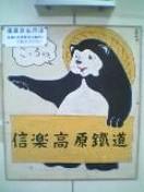 今日はいつものバイト休みの日でしたが、用事で滋賀方面へ出陣でした。んで、これは貴生川駅にて信楽高原鉄道の乗り換え案内の看板です。 信楽焼の狸さんですね~何だかほのぼの系なんで、携帯で撮ってみました。いつもここの駅を利用する人にとって何の変哲も無いですが…。年月が流れてる感じなので、開業以来ずっとあるのでしょうね。この駅で降りたのは、15年以上ぶりです~信楽高原鉄道に乗り換えたんで厳密には降りてないですけどね。母に連れられて、信楽の陶器祭に行きまして…。それからあまり月日は経たないうちに、正面衝突事故が起きたんですよね…。「この前乗ったやつやん!」と驚きました。あの光景はテレビからでも脳裏にかなり焼き付きました…。 んで、話を戻しまして…これはその狸さんのせりふなんデス。「こっちデス」…う~ん、最近に「のだめカンタービレ」を最新刊まで読破したために、そっちの連想をしてしまいました(笑)。決してマングスではないデスよ。むきゃ。これからも、さりげに案内し続けて欲しいですな~。今日の腹の調子…夕方からは落ち着いてます。でも、油断はできないですね…。疲れが出ちゃってるのかなぁ。