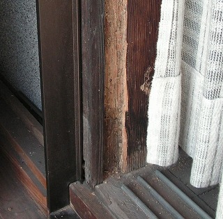 木造建築の建物の、雨戸の戸袋脇の引戸の有様です。