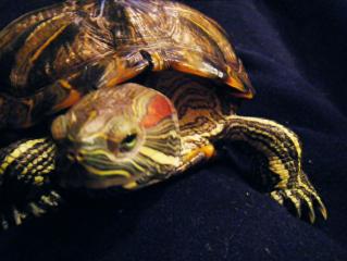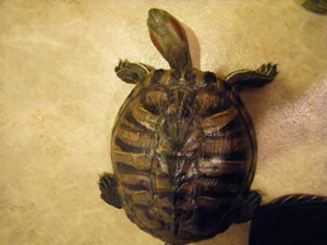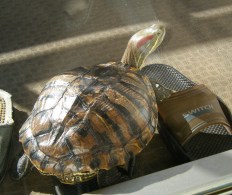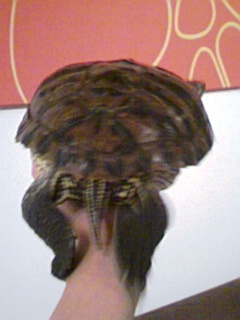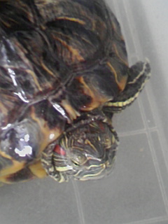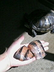 ポロポロと甲羅がめくれました。去年は脱皮しなかったのに・・・どーやら産卵した年は脱皮するみたいです。わかりにくいかも・・・ですが甲羅が浮いてきています。全部ハガレるのかなぁ~?甲羅がめくれた部分はスッキリ!黄色が鮮やかです☆ゲーナもちょっと自慢げです・・・