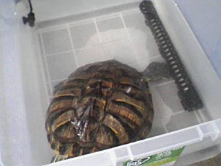 雨の日が多い中、お日様が射した瞬間に強制的に日光浴です。すぐに日陰に入ってしまうゲーナ..こうやってケースに入れて日向ぼっこさせます。しばらくすると甲羅はポッカポカ☆ゲーナ、嫌でも日光浴は大切なんだよぉ~