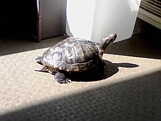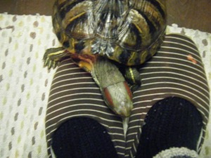 どうしても日向ぼっこの時間が少ないこの時期・・・ベランダに陽が射すと、即効ゲーナを連れて行きます。陽の光でピカピカ光る甲羅を見てると少し春が近づいた気がします。