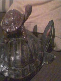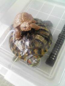 このゴールデンウィークに富山旅行に行ってきました。いい子にひとりお留守番していたゲーナへのお土産はコレっ!魚津の水族館で買った亀のフィギュアです。ミドリガメではないんだけどゲーナの背中に早速乗っけてみました。。なかなか気に入ったみたい。妹分を乗っけた姿も様になっています。“姉御風”を吹かせて・・・おーいどこに連れてくんだい??自分のお気に入りのクッションの中に連れて行ってあげようとしてるのかな?・・・ちょっと無理がありそぉ~ですが。。