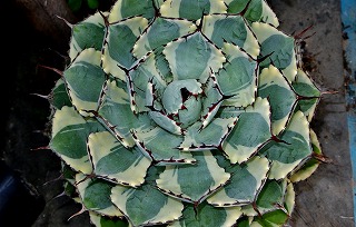 アガベの斑入り種ですが斑色が紅葉の季節になっても映えることもなく年中、殆ど姿や色が変わらない。中型の吉祥冠の斑入り種ほかを・・・。アガベ・吉祥冠(Agave potatorum "kishoukan" var.)屋外で過していた覆輪斑です。ハウス内の地べたに取り込みました。仔吹きして欲しいが、大きく成ると仔吹きしないのは「笹の雪」と同じか。吉祥冠薄中斑上の大きさの株があったんですが、場所取りで屋外に居たのを請われて貰われていきました。その親の仔たちの1つ。アガベ・吉祥冠(Agave potatorum "kishoukan" )青白い葉には僅かに白粉がある。、葉先と縁には黒褐色の鋭い刺と歯牙がある。無地で斑がないが葉色との対比が美しい。アガベ・王妃吉祥天錦(メリコ錦)(Agabe sp. f.variegata=Agave 'Merico Nishiki')外葉が反り返り仔が出ても葉が邪魔で窮屈そう。幾つか仔苗が付いているようです。メリコ錦背高鉢の陰で徒長傾向で葉が長くなっている。アガベ・ベネズエラ(Agave cundinamarcensis)葉厚はちょっと薄い柔らか目で長葉の大型アガベ。強光線では日焼けするし寒さもチョット弱い。「アッテヌアータ」同様室内鑑賞向きですアガベ・王妃雷神(A. potatorum "Ouhi raijin"mediopicta)白中斑(左)と覆輪斑( "Ouhi raijin" variegata) (右)アガベとしては珍しく根元からではなく株中程の葉の間から子株ができる。 1日1回 応援ポチ を・・・