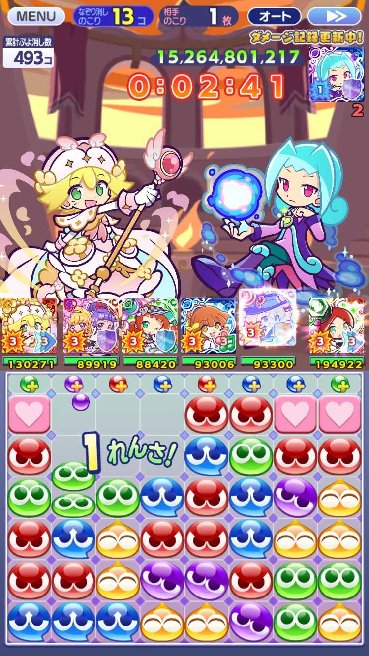 今月も書きます、ぷよクエ日記。ガチャで引きたいキャラが来たのと、ビンゴアリーナが2度もあったため日記1本に収まりきらないほどのネタが入ってきた。昨日の日記(⇒9/20)に続いて、今日は後半にあたる。|・w)っ[第1回ちょこっと裏アリーナ]8月に続いての新イベントだ。ビンゴアリーナのイベントのひとつ、与ダメージチャレンジだけが開催される。部門も無制限ひとつだけだ。相手のラフィソルは、2~3ターン目に宿り木と怯えの状態異常を使い、続いて無属性50000の全体攻撃を放つ。怯えを解除できないとダメージは2倍の10万となり、無策でしのぐのは難しい。さらに「スキル使用ぷよ数が10増加」のステージ効果もある。そこで、サポートにオンステージのりんごを起用。開幕から3ターンが経過するまで、ターンごとに味方全体の状態異常を解除する。これで前述の全体攻撃をしのぐ。次は、開幕のかたぷよ8個の処理だ。おじゃまぷよ砲は6ターン目に来る。それまでに、連鎖のタネ生成のスキルを溜めて盤面をリセットする。キュアミラクル&マジカルか、ひやくのウィッチのスキルを使おう。そして、喫茶店のアルルの出番だ。実は、今回のラフィソルはディレイに対し1ターン短縮の耐性しかない。2ターンごとにスキルを打てば、相手をハメることができる。毎ターン連鎖のタネで攻撃すれば、チャージも間に合う。あとはカフェアリィと喫茶店のアルル、オンステージのりんごのスキルを維持しつつ「戦乙女アミティ⇒ひやくのウィッチ×2⇒連鎖のタネ」と「キュアミラクル&マジカル⇒連鎖のタネ」のターンを交互に繰り返す。この戦法で、40Gダメージを達成。前回同様に11桁まで乗せた。11433位だ。今回は報酬の参加賞ラインが15000位と普段より高いが、いつも通り参加賞のひとつ上には届いた。今回のメンバーは、アルル、アミティ、りんご、アリィ、ウィッチ、みらい(ミラクル)、リコ(マジカル)。絵に描いたようなヒロイン共演が実現した。ランキングを見ると、今回は戦乙女アミティの使用率が非常に高い。上位100人の9割以上がリーダーに選択、さらに169位までの全員がリーダーかサポーターに起用していた。他には、3月の「転生したらスライムだった件」で登場したミリム・ナーヴァもよく見かける。こちらは主力にするなら★7前提なので、もし引けても活かせてはいなかっただろうけど。|・w)っ[第14回ビンゴアリーナ]続いては、今年4度目のビンゴアリーナ。ビンゴシートを5枚全部埋めれば、結構な量の資材が手に入る。少し時間かけてもコンプリートしたいイベントだ。今回の難関は、5枚目に入っている「体力タイプ限定」。主力カードに体力タイプは少なく、限られた戦力で挑むこととなった。攻撃系のスキルを持つカードが不足しやすいが、冒険の魔導師アルルを起用できるという明るい材料を発見。連鎖のタネ要員を務められる。自前では持ってないので、サポート枠で。開幕に、かたぷよ7個が盤面に加えられる。7ターン後に1個でも残していると、おじゃまぷよ砲で全滅する。まずはこれを回避しよう。このデッキで挑んだ。実は、相手は封印に対して1ターン短縮の耐性しかない。リーダーに起用したウィッチver.キュアミラクルで封印しつつ、ミヤビ(3番)でネクストを赤ぷよに変換する。連鎖のタネで全消しすれば、ウィッチとアルルは1ターンでスキルをリチャージできるので次のターンも再び両者のスキルを使えば、ハメが成立するというわけだ。これで完封できるが、火力にまだ課題がある。体力タイプ限定ゆえに、ひやくのウィッチのような砲手がいない。連鎖のタネに十分な強化をかけないと、火力不足で時間切れになる。残り3枠はその強化に充てよう。先月入手したアリィ(4番)は、とくもりスキルで「全員の全ステータス1.3倍」を付けられる。ビンゴシートを5枚ともコンプリートした後は、おなじみ裏アリーナ。7分の制限時間で、累計ダメージを競うイベントだ。いつも通り、無制限部門に加えて制限部門2つが用意された。無制限部門は前述の裏アリーナと同じ作戦で挑んだが、順位は15472位と前回より下がった。今回の制限部門その1は「攻撃・体力タイプ限定」。また今回も冒険の魔導師アルルの世話になるが、ウィッチver.キュアミラクルとはスキル加速が被る。そのため、リーダーはカフェアリィを起用。こちらの相手も封印を無効化できず、ウィッチのスキルで止めることができる。そしてアルル、アリィ、ミヤビの組み合わせでスキルを回し、ハメが成立するわけだ。結果は2.8Gダメージで、8941位だった。制限部門その2は「★7でコスト59以下のカード限定、かつ控え使用不可」。類似の制限は以前にもあったが、今回はコスト60ではなく59が上限。ぷよフェス級のカードが対象外になる。数字上では1の差に過ぎないが、作戦上はこれだけでかなり話が変わる。今回、リーダーにはトワを起用。「消すごとに」のスキル加速を持っているカードは、ぷよフェス級未満では本当に珍し
