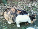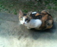 知らない猫が庭にいました。 背中が変なマダラ模様の三毛猫 カタメちゃんは、右目がないのですが、 このコは、左目がないです