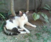 お庭に、カタメとマダラがきてました ヨネスケとカタメとマダラは、 3匹とも仲良しです。 問題は、ウチのニャー様が、 どの猫とも相性が悪いというコト