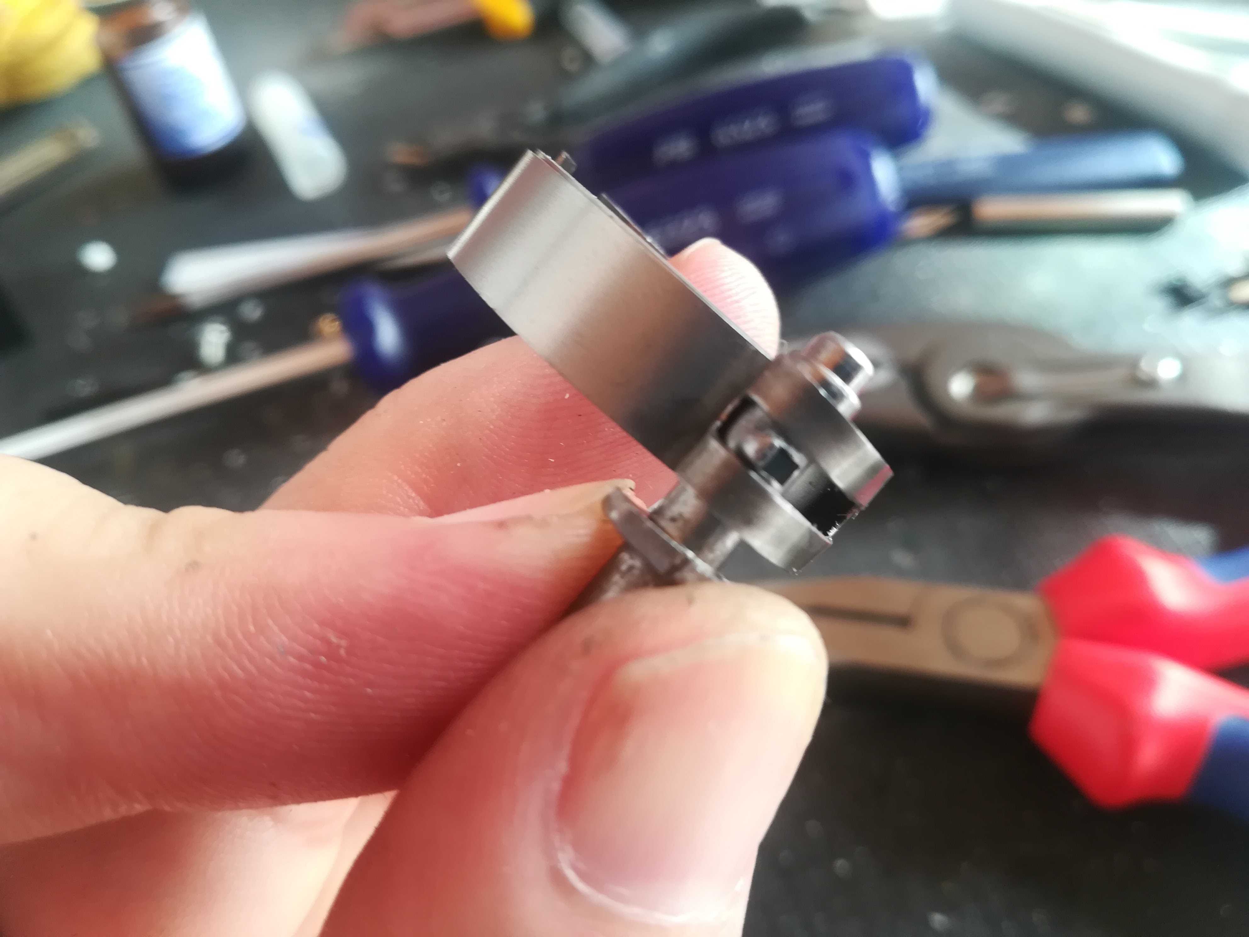 その後香箱を閉じて動作確認を行った所、きちんと動く時と、動かずに、せっかくゼンマイを巻いても、一瞬でゼンマイが戻ってしまう時が。どうも軸がゼンマイから抜けちゃうのが原因っぽい。