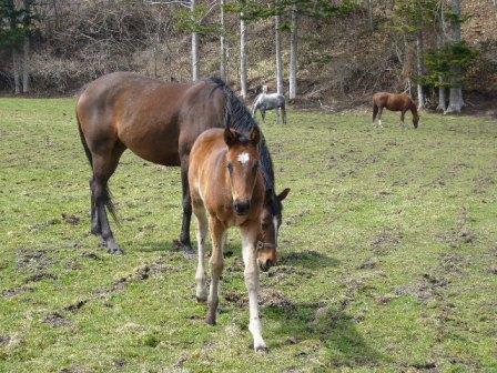 夕方馬を入れようと準備していると、かすか~に聞こえる妙な音。「くしゅー、くしゅー」というその音の正体は・・・チビのいびき よーく見てみると、クッキーのこっこが立ったまま居眠りしてました。か、かわいいこのチビちゃんは、馬房でクッキー母の手入れをしているときに周りを走っていて、母の向こうにまわった瞬間、いびきをかいて寝始めたというエピソードもあります・・・。突発睡眠タイプなんだろうか。うちの夫もいつでもどこでも3分で寝られる人ですが、そういうタイプが馬にもいるのかな?今夜から雨というので、放牧地のボロ拾い、そしてトラクターで地面をならし、浮き上がってきた石を拾い・・・。雨が降ると地盤がゆるんでトラクターが入れなくなるので、昨日今日で一気に片付けてしまいました。今週はうちの馬は出走しなかったので、ひたすら放牧地をうろついていました。でも天皇賞は見ましたよ。ディープインパクトはすごいですねー。なんと言ったらいいのやら。ふつうに当たり前に勝ったという余裕すら感じるレースでした。これからは世界で活躍する馬になれそうですね。馬屋にとってはゴールデンウィークもなにもないわけですが、国道の交通量が増えたり、道行く車のナンバーが見慣れない地名だったり、暦どおりお休みの勤め人からお誘いがあったりすると、連休なんだな~と実感します。昨夜は韓国に赴任して帰国した友人の家からお招きがあり、楽しい夜を過ごしてきました。3家族に4人の子どもたち、それも2歳前後ですからその大騒ぎは推して知るべし。ふだん大人とばかりいるうちの息子なんかはテンション上がりまくりで帰ってきたらぐったりしてました。やっぱり子どもどうしって楽しいんですねー。夫も友人たちが帰省してきて飲みに行ったりしてるし、自分たちがわざわざ遠くに出かけなくてもけっこう連休中は楽しめるものです。子どもが大きくなってきたらそうもいかないのかもしれませんが。