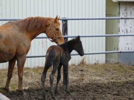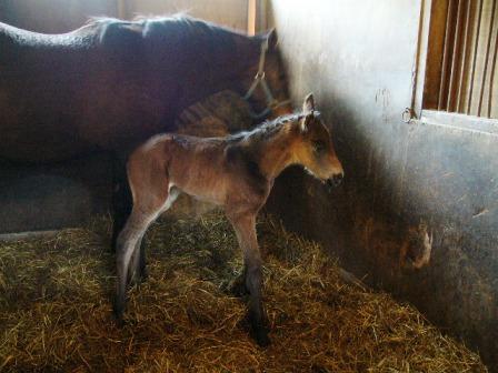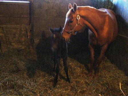 昨夜10時ごろ、トロピカルメイクが無事に出産しました!またまたお嬢さんでしたこの馬は預託馬で、馬主さんも遠くでお気にかけてくださっていたので、ほっとされたことと思います。とても元気な子ですよ。今は真っ黒に見えますが、目の周りに白い毛があるので葦毛のようです。父はシルバーチャームで、この子も葦毛になりそうですしね。お父さんの遺伝子が強いのかな。何はともあれ、何事もなく生まれてきてくれてよかった!今週の出走馬ですが、4頭走ります!今日は、阪神1Rにシュンキチ、5Rにナイスドリーム、10Rに久しぶりですね~、マルブツスピーディーです。マルブツは足の状態良くなったようですね。楽しみです。弟に負けていられない!明日は阪神2Rでビッグスターオーが出ます。どれか勝ってくれたら嬉しいなぁ~。