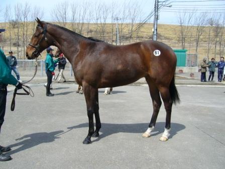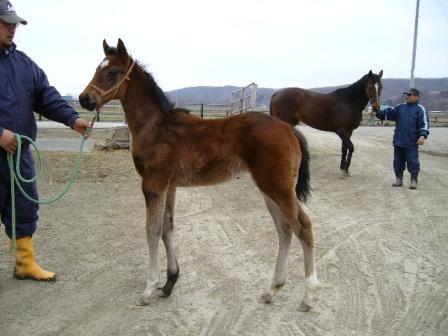 そろそろ当歳も7割方生まれている時期なので、調教師さんや馬主さんたちの来場が多い時期です。土日の競馬を終えてその足で飛んでこられるパターンがほとんどなので、調教師さんは月、火曜日あたりの来場が多いのですが、当場にも昨日今日と何人か立て続けに馬を見に来られました。わざわざここまで足を運んでくださるのはとてもありがたいことと感謝しています。競馬といえば、日曜のレースで最後着だったマルブツスピーディは、どうやらレース中に故障したようです。それであんなに突然ずるずる下がっていってしまったんですね。程度は軽いようだという話ですが、以前にも脚を痛めているので心配です。能力のある馬なのでなんとか回復してほしいのですが。それからスーパーホーネットは、未確認情報ですがしばらく休ませるような話を聞きました。まだ調教師さんとお話していないので確認できないのですが。やはりあの体重減ですからマイルカップに間に合わせるのは厳しいのかな。まだ3歳の春ですから、ちょっとゆっくり過ごさせるのもいいかもしれませんね~。元気いっぱい、気合十分のホーネットが見たいですから。しばらくお天気が悪くて、今朝も雨やみぞれがぽつぽつ降ってくる空でしたが、10時ごろに少し太陽が出てきたので寝藁を干しました。子付きの馬房は大量に濡れた寝藁が出るので、2,3日干せない日が続くとすごい山になってしまうんです。明日からまた数日天気が悪いようなので、できれば少しでも乾いてほしい・・・でもくもりがちな空です。で、夫はマイドリームビギンの種付けで社台に行きました。お相手はクロフネなんですが、とーっても予約が詰まっているようで、2日前から電話して予約を入れて、なんとか排卵がうまくいきそうなのでほっとしてます。ふつうは直検して卵を確認してから「今からあいてる?」とか「明日お願いします」とか電話するわけですが、込んでいる馬は予想して予約を入れるということになるのでタイミングが難しいわけです。無事にとまってくれるといいですが。↓育成場より届きました。ユウサンポリッシュ04(ダンスインザダーク 牡)です。今年期待の1頭です。