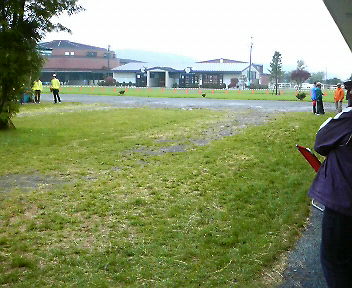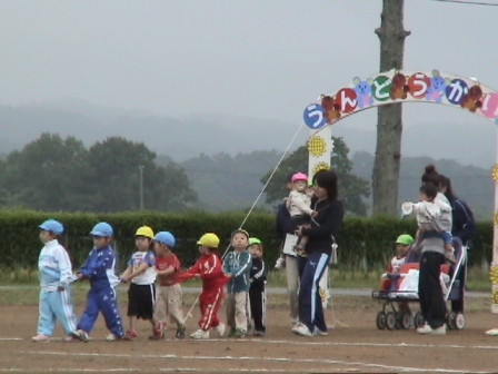 昨日はなぎの通う保育所の運動会でした!前日は雨、当日は晴れの予報でしたが時折霧雨の降るびみょーな天気・・・。それでも運動場で決行しました。でも7月というのに肌寒くて、大人はみんなジャンバーはおってました。さて、入場行進です 前の子の服を引っ張って、みんなつながって行進してます。最初の出番はかけっこ! 3歳児のかけっこはおもしろい!スタートのピストルが鳴ってもぼーっと立ち尽くしていたり(笑)うちの子はコースを大きく外れてすごい遠回りしてるし 4,5歳児になると急にみんな真剣になり、競技らしくなってくるのにびっくり。1年の成長ってすごいのね。ゴールの後は、先生とハイタッチ障害物競走のようなものもありました。まずはスクーターで走っていくのですが、なぎは思いっきり無視 ひとりそのまま走り抜けていきました(笑)で、次に帽子を拾ってかぶるところで自分がかぶったら一緒にスタートしたお友達を待ってそれからまた一緒に走り出すさらにハードルをジャンプするのも無視 思いっきりコースをショートカットして走っていきました おもしろすぎ・・・。そしてお遊戯 「ぼくらはみんな生きている」のダンスです。なぜか振り向いてカメラ目線だし親子競技やPTA競技もあります。わたしたちは夫婦で綱引きに・・・。まぁね、夫は当然の役回りですね。その頑張りあって?みごとわがチームは勝ち抜きましたそうそう、リレーっていうのもありました!これも最高!我が息子は手をたたきながら走ってたし(で、抜かされた)バトンを渡されてもしばらくたたずんでいる子とか、チームプレーがよくわからないのでとりあえず走って満足してたりとか、とーってもほのぼのしてておもしろいってかんじで、楽しく半日過ごしてお弁当を食べ(義母が頑張って作ってくれました)ごほうびをもらって帰ってきました。それにしてもこのあたりの運動会って、地元の人たちの娯楽の場でもあるんですね!全部で23世帯という小さな保育所の運動会なのに、大人の数がすごい。テントを張ってそこで見てたり、うちの隣のシートではおっちゃんたちが近所の食堂の出前をつまみに4リットルの焼酎とビールを飲みながらすっかり宴会状態子どもの運動会っていうより、お花見のようでした。夫いわく、昔の運動会はみんなそんなかんじだったと言ってましたが、私はびっくり!私も決して都会育ちじゃないですけど。なんだかとってもほのぼのしてて楽しい運動会でしたそして今日は朝から腕が上がりません