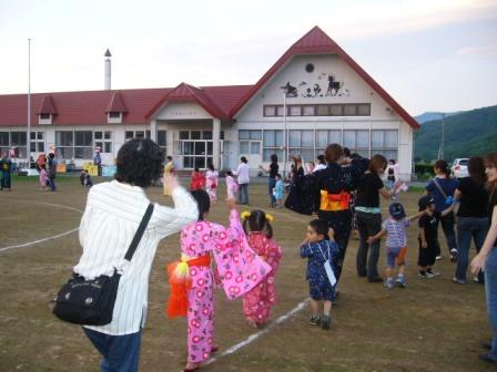 連日夏らしいギラギラ太陽が照りつけてます。朝晩はそれなりに涼しいですが、日中は外で仕事してると汗がとまらない。アブも多いし。なんだか仕事もいろいろとあって忙しいので夜になると毎日ぐったり9時ごろになると眠くて起きていられなくなって、下手すると子どもより先に寝付いてしまうこともそんな好天に恵まれて、昨夜は保育所の夏祭りでした園児たちとその家族が保育所の校庭に集まって、盆踊りしたり夜店(風船とか菓子引き、フランクフルトやパンなど)で遊んだり、スライドを見たり・・・と楽しく過ごしました。子どもたちは浴衣や甚平を着てる子が多かったですが、だんだん寒くなってきて結局上着を着たりしてました。北海道の夏祭りは上着が必要(笑)来月はあちこちでお祭りがありますが、どこでも混雑がひどくて子ども連れは大変ですよね。その点昨日は保育所のお祭りなので規模は小さくても親子ともどものんびりと楽しめて、とってもよかったです。おとーさんたちはいつの間にやらみんな真っ赤な顔して宴会してるし。↓ナギお気に入りのイヌの形の風船(親たちの手作りです)