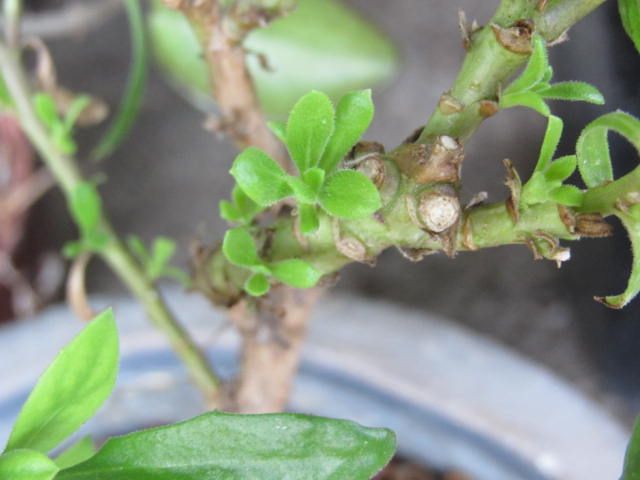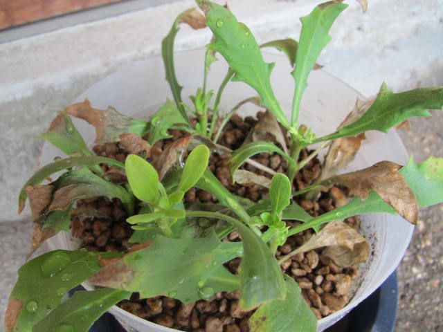 うちに来た当初はもっとわさわさしていましたが、かなりしぼんでいます。こんな時は雨だ!ということで、雨の日に水浴びをさせました。しぼんだところもありますが、こうやって脇芽も出ています。一応、大丈夫そうです…。