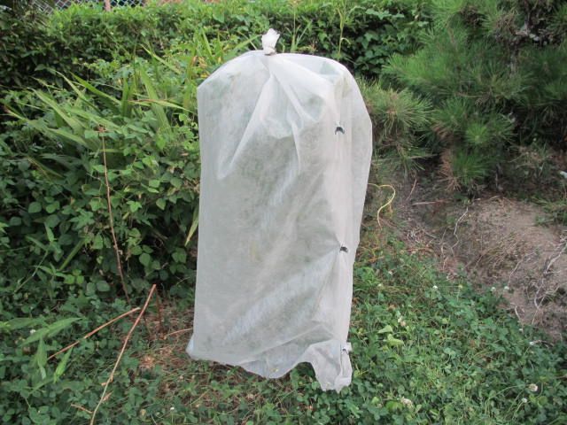 不気味な出で立ちですが、レモンです。夏に伸びた枝はハモグリバエの被害のため、すべて剪除しました。その後、また新しい葉っぱが芽吹いてきたので今度こそは被害を防がなくては。ということで、すっぽり不織布を被せた次第です。アゲハの卵がたくさん産み付けられていたので、まずはそれを取り除きました。そして、幼虫がいないこともちゃんと確認。不織布がどれだけ効果を発揮してくれるか、また報告します。