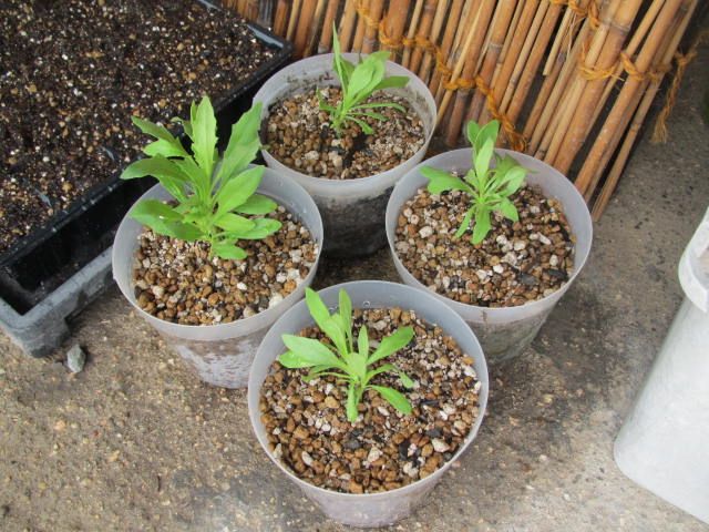 今年仲間入りした、「セレニティ ラベンダーフロスト」という品種のオステオスペルマム。花後に剪除した枝を挿しておいたところ、発根しました。肝心の挿し芽はこちら。暑さに度々萎れていましたが、なんとかここまでこぎつけました。さて、どこに植え付けようかな。
