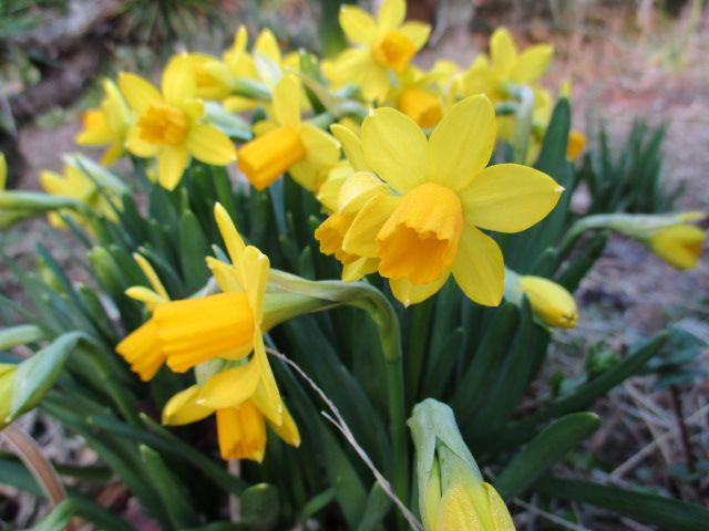 今、いろんな水仙が咲いています。うちの庭だけでこんなに種類があるとは。ラッパスイセンの一種でしょうが、これは黄色一色です。葉っぱがネギみたいに細いのが特徴です。これもラッパスイセンです。ラッパ部分がとても大きいですね。こちらはオレンジ色のグラデーションがきれいです。これも。これも水仙です。こんなのもあります。少なくとも、もう一種類あるんですよ。もうすぐ咲くはずです。