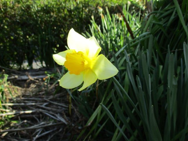 生垣の中に咲いていた水仙です。薄暗かったせいかピントがやや甘いですね。ニホンスイセンと同じような配色ですが、こちらは中心が八重になっています。どうやら、ニホンスイセンの八重品種のようですが、本当のところはなんという名前なんでしょうか。うちにはいろんな水仙がありますが、正確に数えたことはありません。今年は追跡しようと思っています。