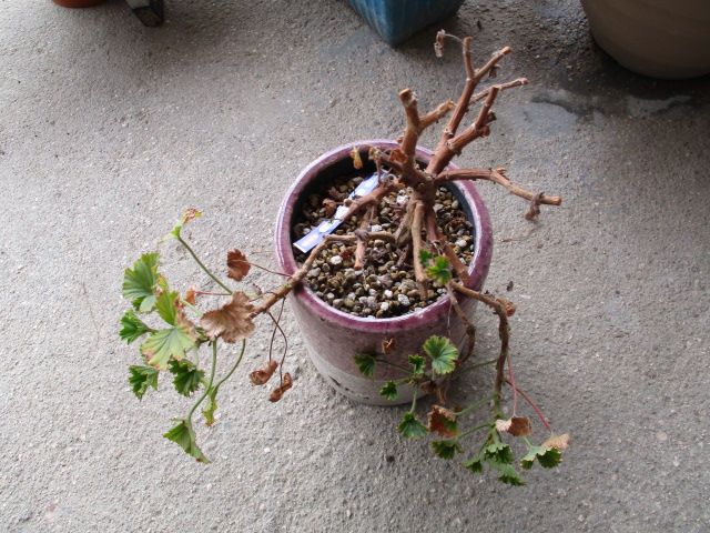 さて、これは何でしょう。去年の母の日に、母が妹から贈られたゼラニウムです。ピンクの花が咲きます。去年8月に植え替えてから、7ヶ月が過ぎました。冬が越せなかった、と思っていたら、そうでもないようです。木質化した茎から芽吹いています。格好は良くないですが、生き延びることができました。