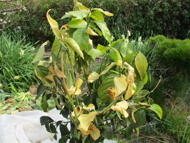 防虫のために不織布で覆っていたレモンです。防寒にもなるので、そのままにしておきました。時折、不織布から透けて見える葉っぱが黄色になっているのは知っていました。でも、見なかったことにしていました。はぐってみたら、やはり…。あれだけ寒かったら仕方がないですね。枯れてしまった細い枝もありましたが、おおむね大丈夫そうです。落ちた葉っぱの根元から、新葉が芽吹くことを期待しています。