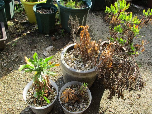 やっておいてよかったです、挿し芽。ちょうど3年前から育てていたオステオスペルマムですが、とうとう初代が枯れてしまいました。中央の鉢がそれです。でも大丈夫。右上の鉢は3年前に、手前の二つの小さな鉢は去年に挿し芽にした株が残っています。今のところはあまり元気がないように見えますが、つぼみはたくさん着いています。危うく、姿を消してしまうところでした。