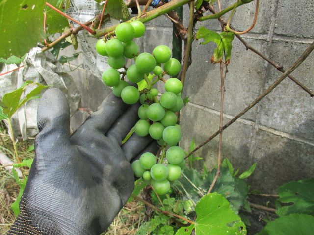 ブドウは袋をかけてから3週間が経ちました。一つだけ袋に虫喰いのような穴ができていたので、袋を交換しました。途中で中を見ることは滅多にないので、この機会に記念撮影。粒は不揃いですが、ずいぶん大きくなりました。