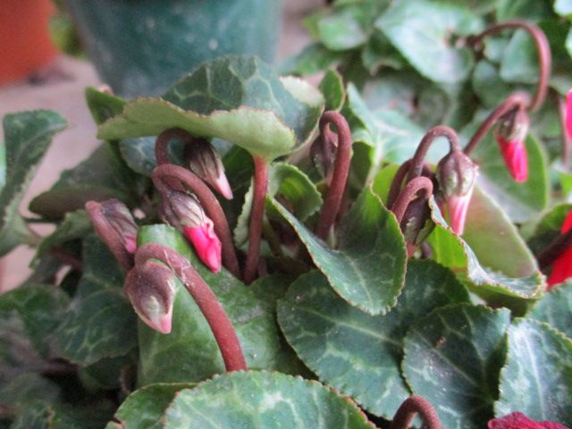 去年11月から育てているガーデンシクラメンです。三色のうち、赤い花の株にたくさんのつぼみが着いています。一時、元気がなかったんですが、急に盛り返してきました。白とピンクは種子がたくさんできていますが、花はもう終わったようです。それにしても、ガーデンシクラメンってこんなに長期間咲き続けるんですね。